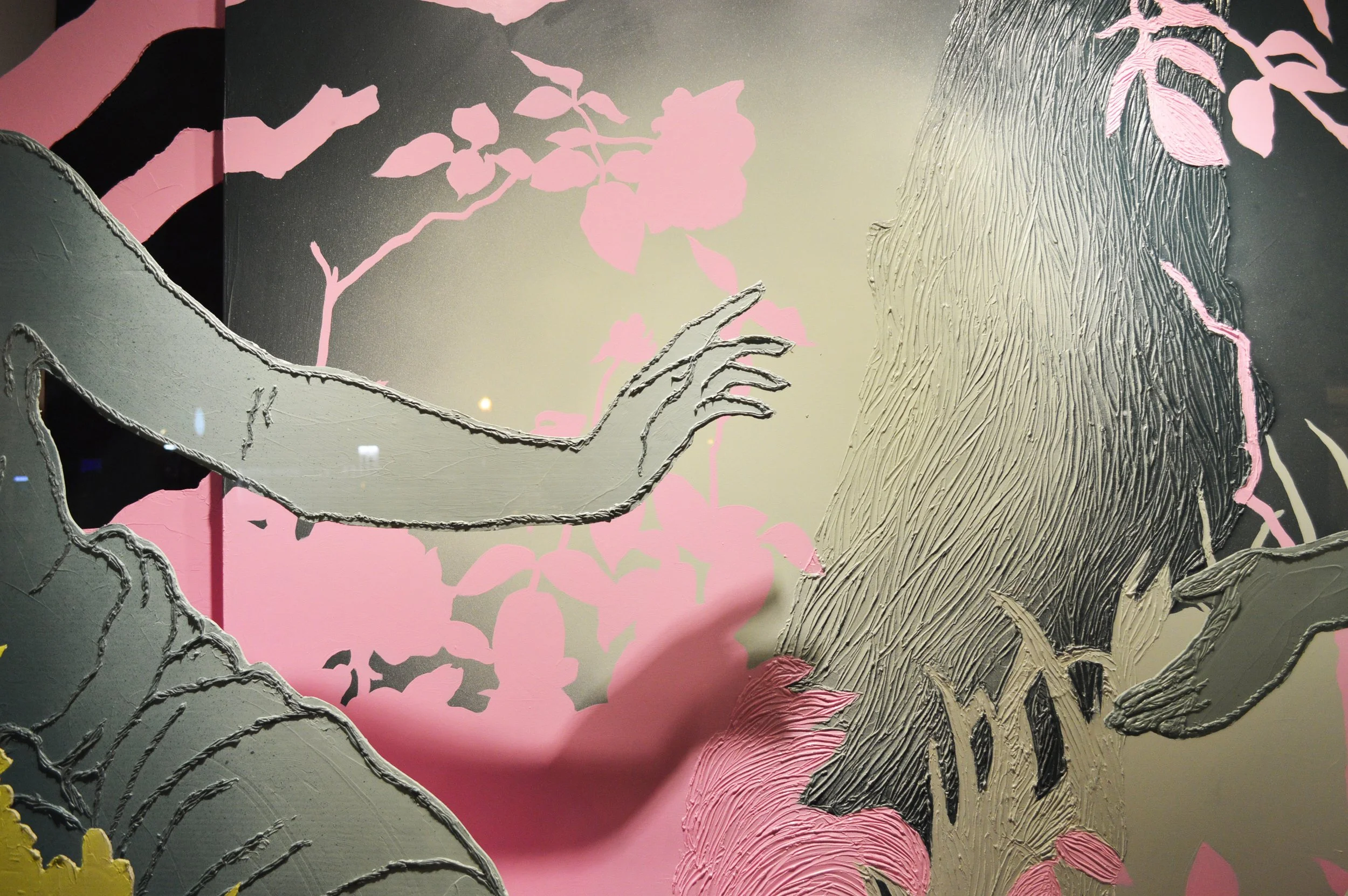 ABOUT THE EXHIBITION: Translating her two-dimensional style of layered flat silhouettes and experimental landscapes, MK Bailey creates a florid setting pulled from the pages of Drago Jančar’s book The Tree with No Name. Between the layers inspired by the novel’s rich imagery, the audience will lose the thread between one reality and another, ricocheting between nostalgia, displaced identity, and anxiety about the present.